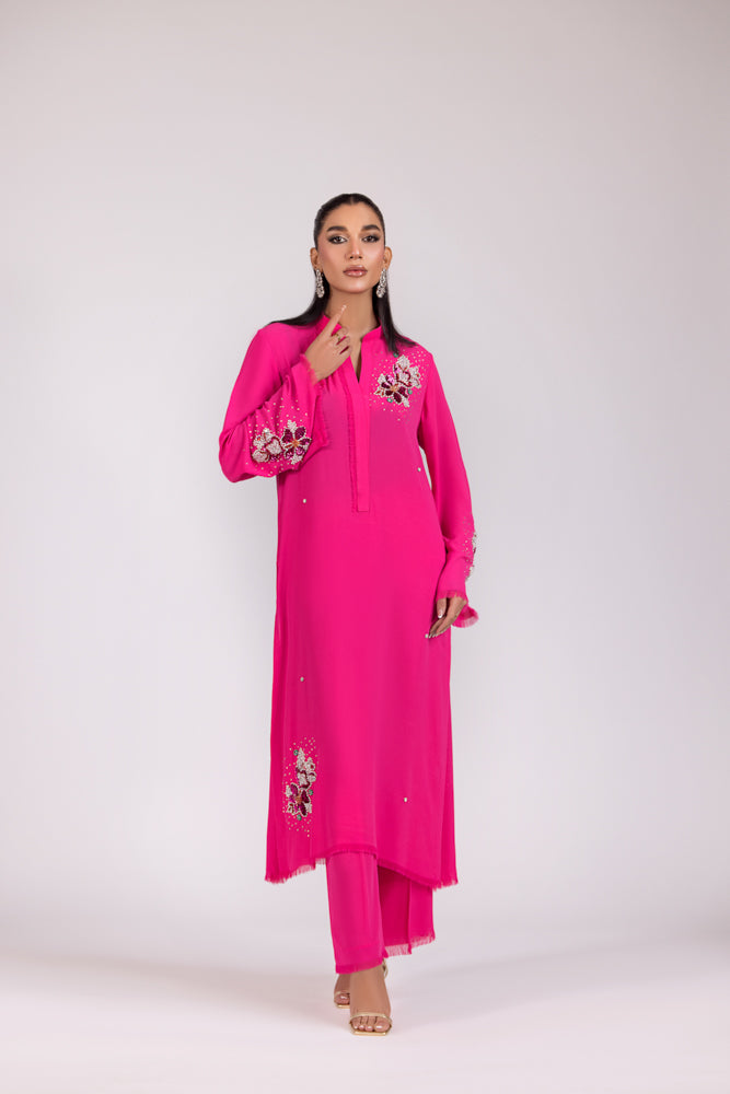 Perfect for formal evenings, a vibrant fuchsia hued georgette dress effortlessly balances elegance and ease. with an A-line cut and loose trousers. The use of 3d floral motives in sequins and pearls gives the dress its glamour quotient. A must have in your wardrobe!