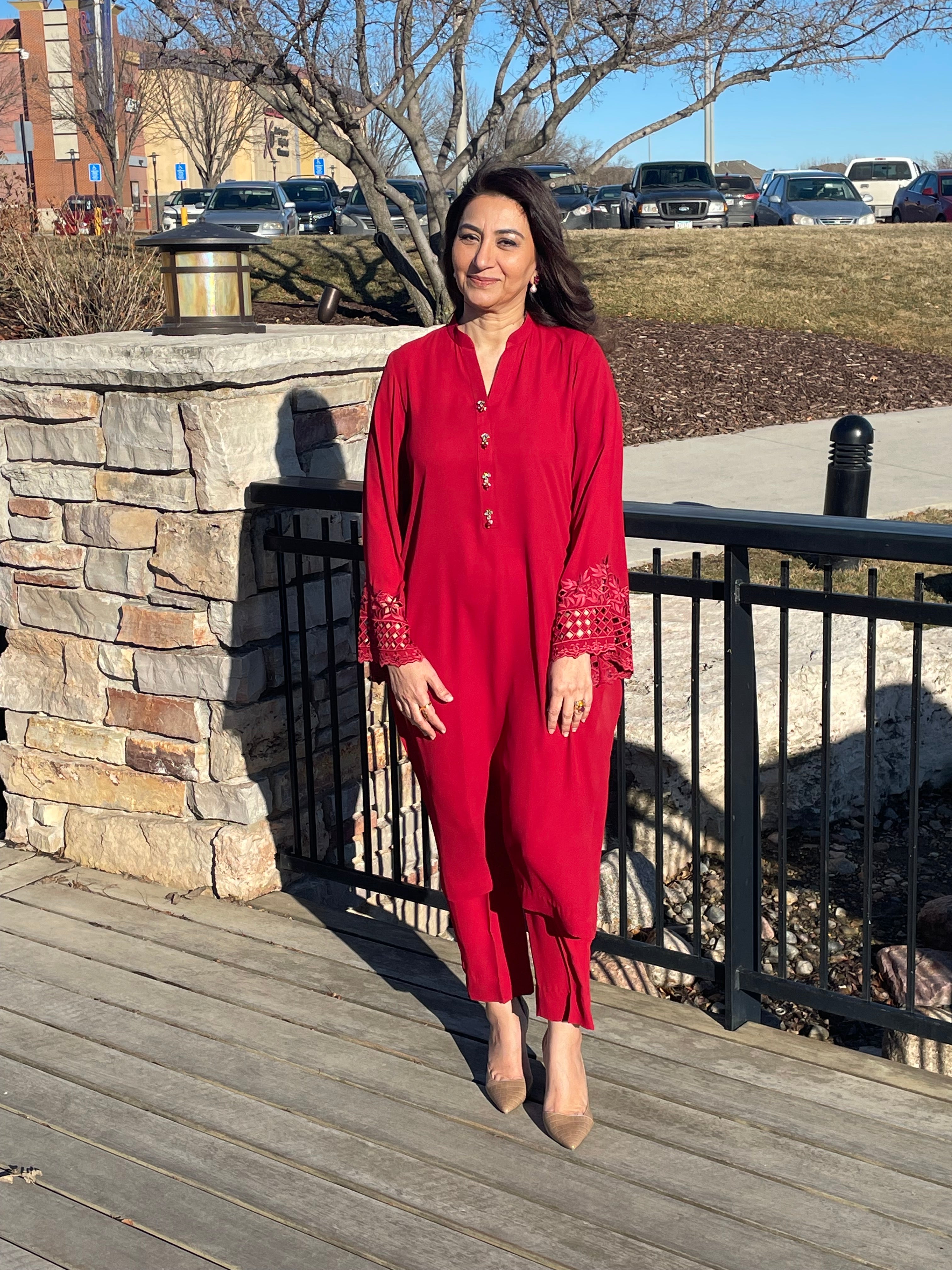 A soft fabric and a simple silhouette define this dress. Detailed cutwork on sleeves and fancy buttons enhance the look of kurta.
