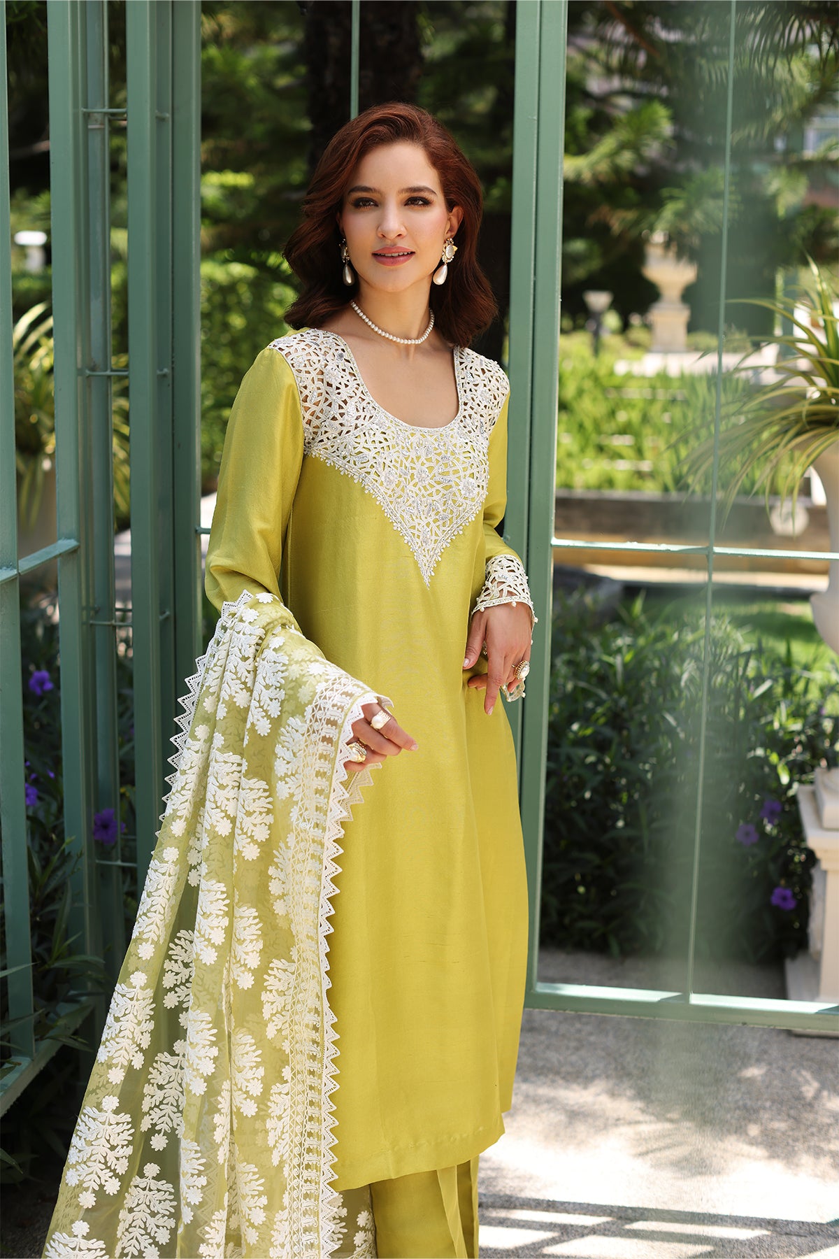 In this dress, fine cutwork is superbly crafted on silk. Paired with aari work motifs and border on net dpta. This alluring design is a timeless creation that can be styled in many ways.