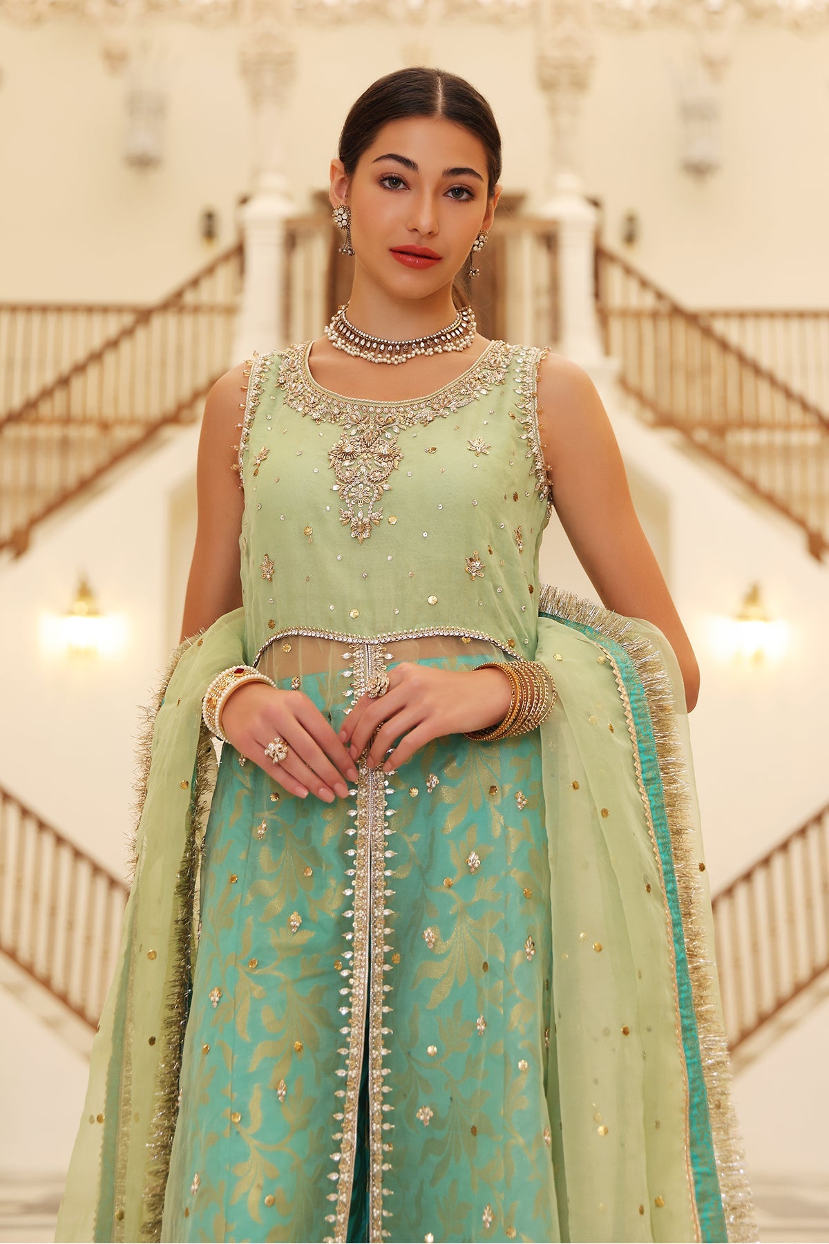 A fusion of the contemporary long dress with the traditional peshwas. This refreshing combination of minty green with turquoise etches a dreamy look. The finesse in hand embroidery on bodice, panel edges and sprinkle of kaamdani is intricate. The 3 yard organza dupatta with kaamdani and detailing in double edging with two tone kiran is striking. Worn both as a modern outfit to mehndis or with a dupatta on head for nikkah. This is a classic timeless ensemble to have.