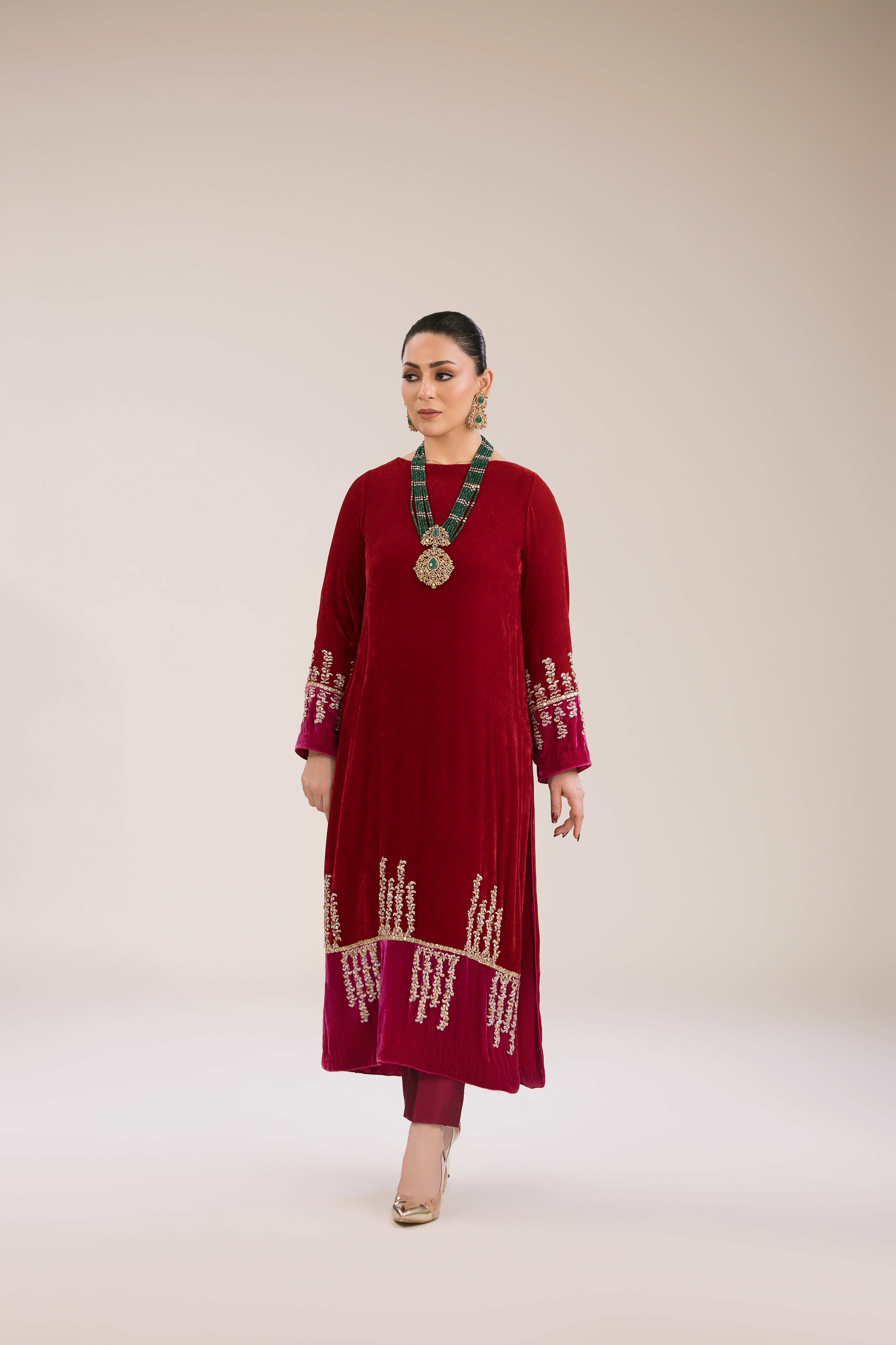 This stunning deep red velvet ensemble is the epitome of classic elegance with a modern twist. The rich, luxurious fabric drapes gracefully, while intricate silver embellishments add a touch of opulence to the sleeves and hem. The kurta features delicate handwork with mirror and thread detailing, offering a timeless festive charm. Paired with straight-fit matching trousers, the outfit strikes the perfect balance between traditional and contemporary style.