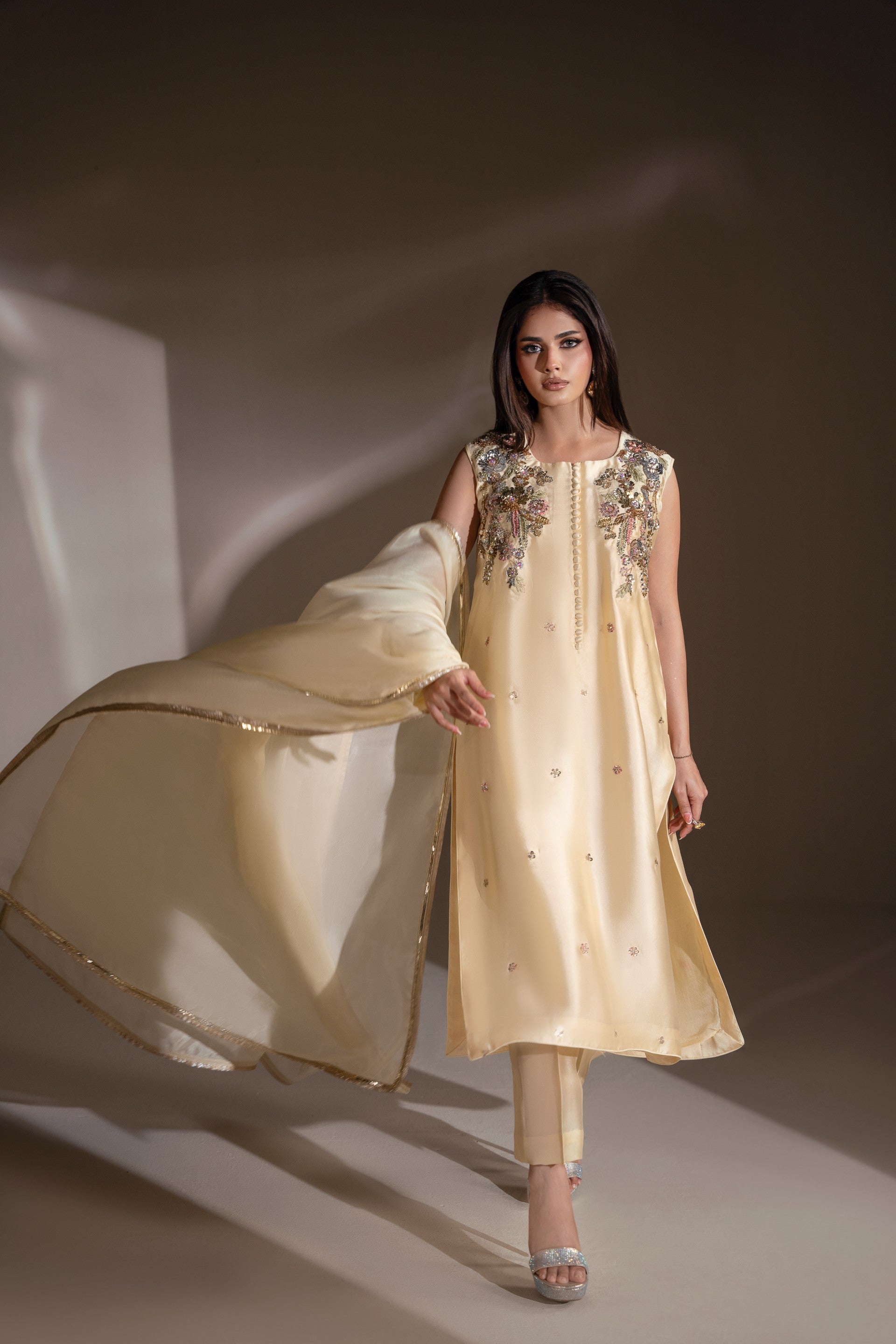 Soft champagne tissue silk with a relaxed, flowy silhouette—Nooré is made for girls who love effortless Eid looks with a luxe edge. Delicate floral embellishments add just the right sparkle, while the minimal cut keeps it fresh, modern, and Instagram-ready. Perfect for Eid brunches, family gatherings, and festive evenings.