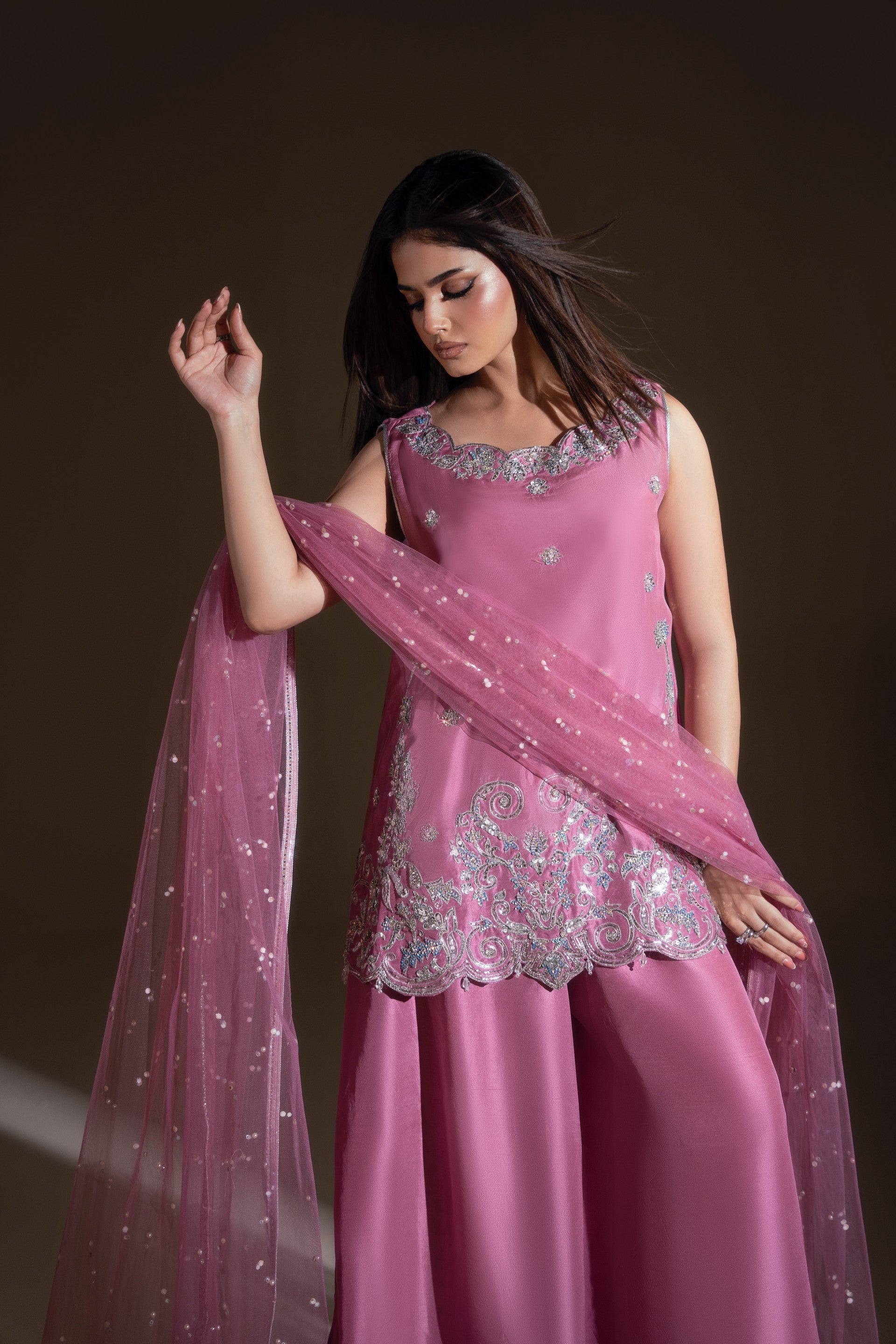 A color palette to soothe your Ramadan Iftaars. Soft tones of Pinks, Peach or Silver Grey are dyed in Pure Raw Silk, hand embroidered in silver details with fine quality embellishments. Paired with wide flared pants and a net dpta with pearls & silver spray.