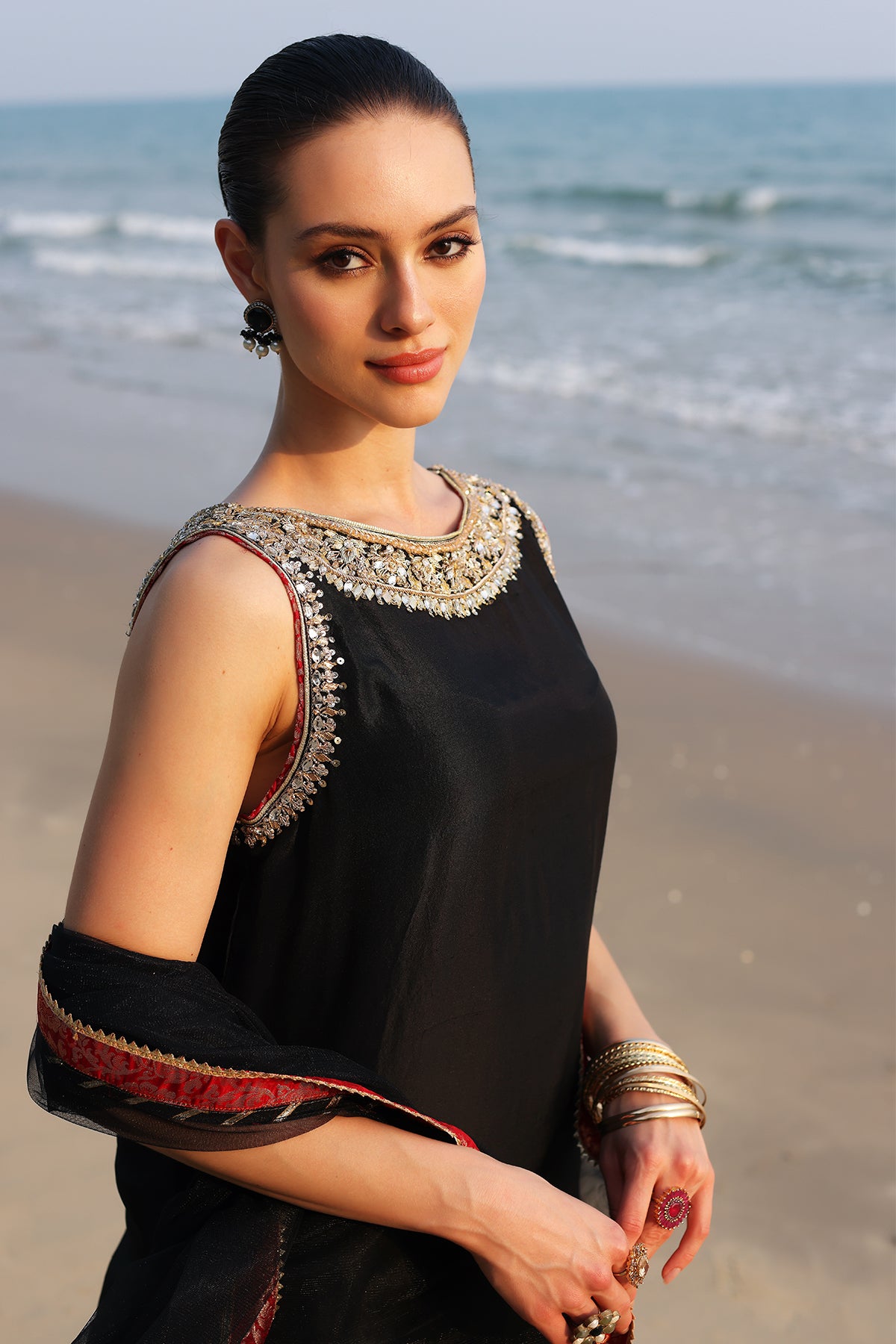 An extremely stylish suit with rawsilk long shirt worked in finest zardozi work and laiden with aesthetically chosen laces. Paired with a jamavar sharara pants and a net organza dupatta. The sleeves come with the suit and dupatta has dual edgings. Can be ordered in any color of your choice.