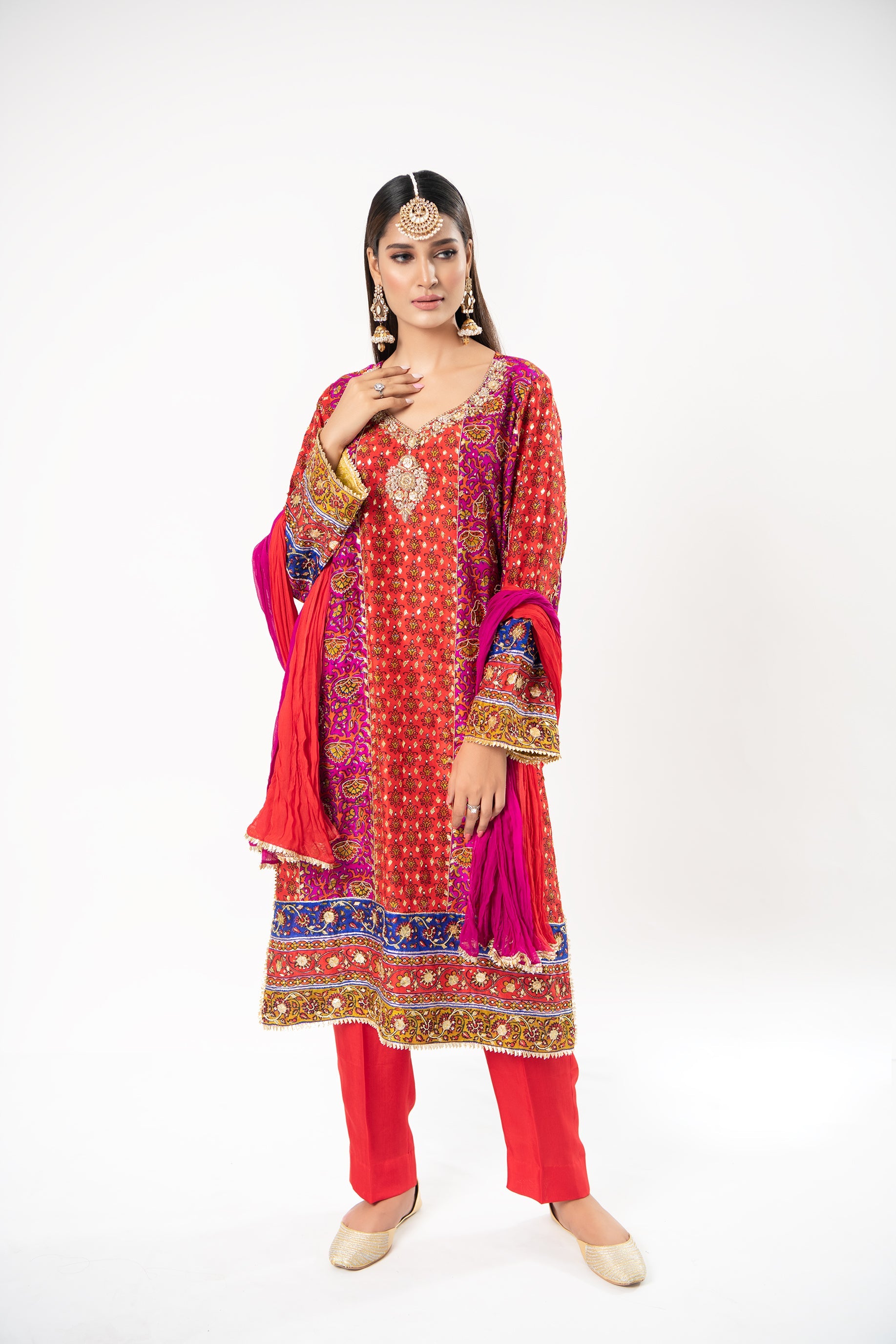 Our signature screen print design embellished and intricately worked in zardozi work to create this majestic look. A play of pink, magenta and mehndi colors on a red canvas. Heavily worked neckline and borders make it a perfect attire for mehndi functions. Paired with a pure silk trouser and a chunna hua two colored dupatta.