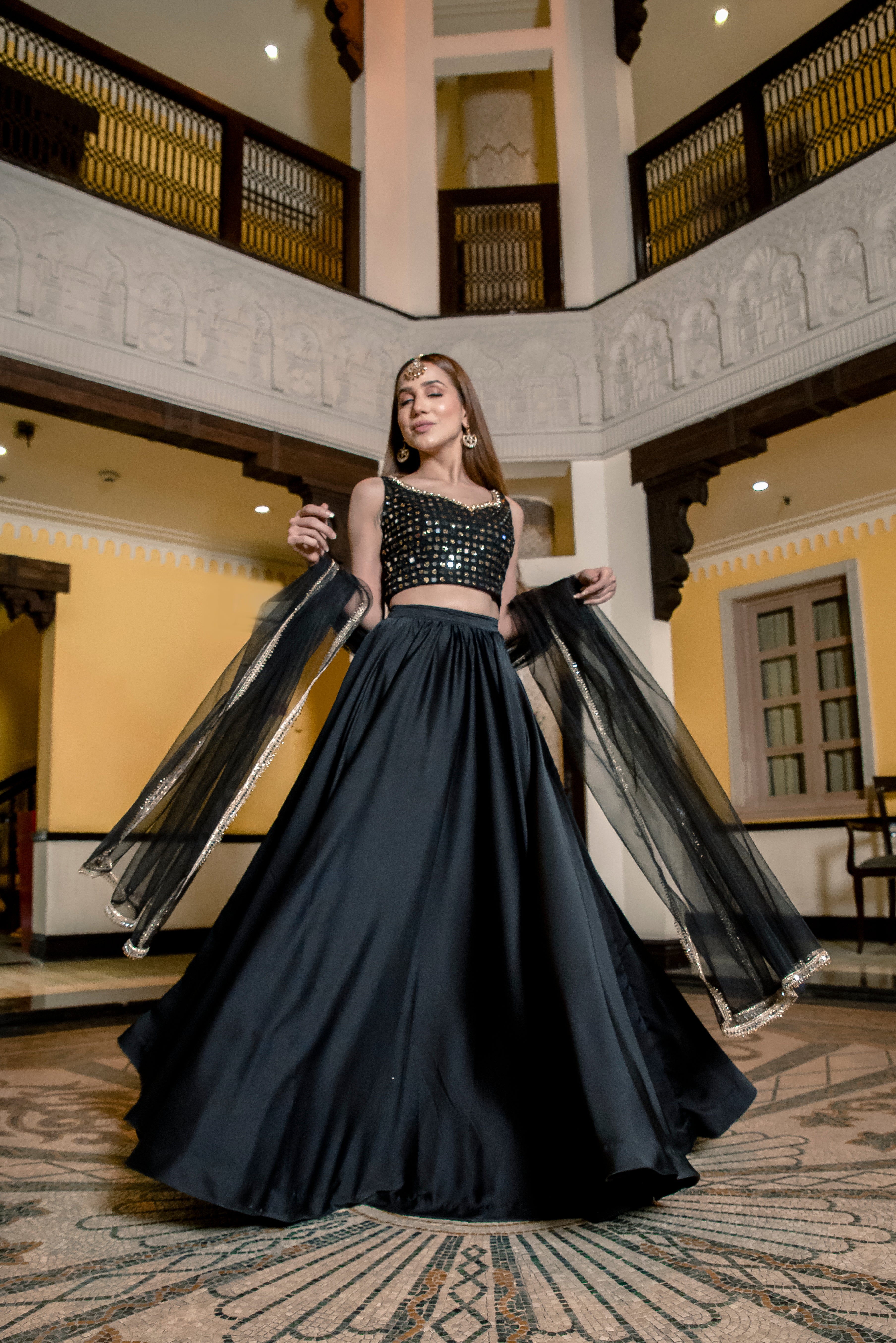 A heavy black satin silk Lengha with a stunning fall paired with a hand-embroidered Chikankari choli embellished with mirrors. This flared lengha choli comes with a net or organza dupatta edged with beautiful mirrored lace trimming.