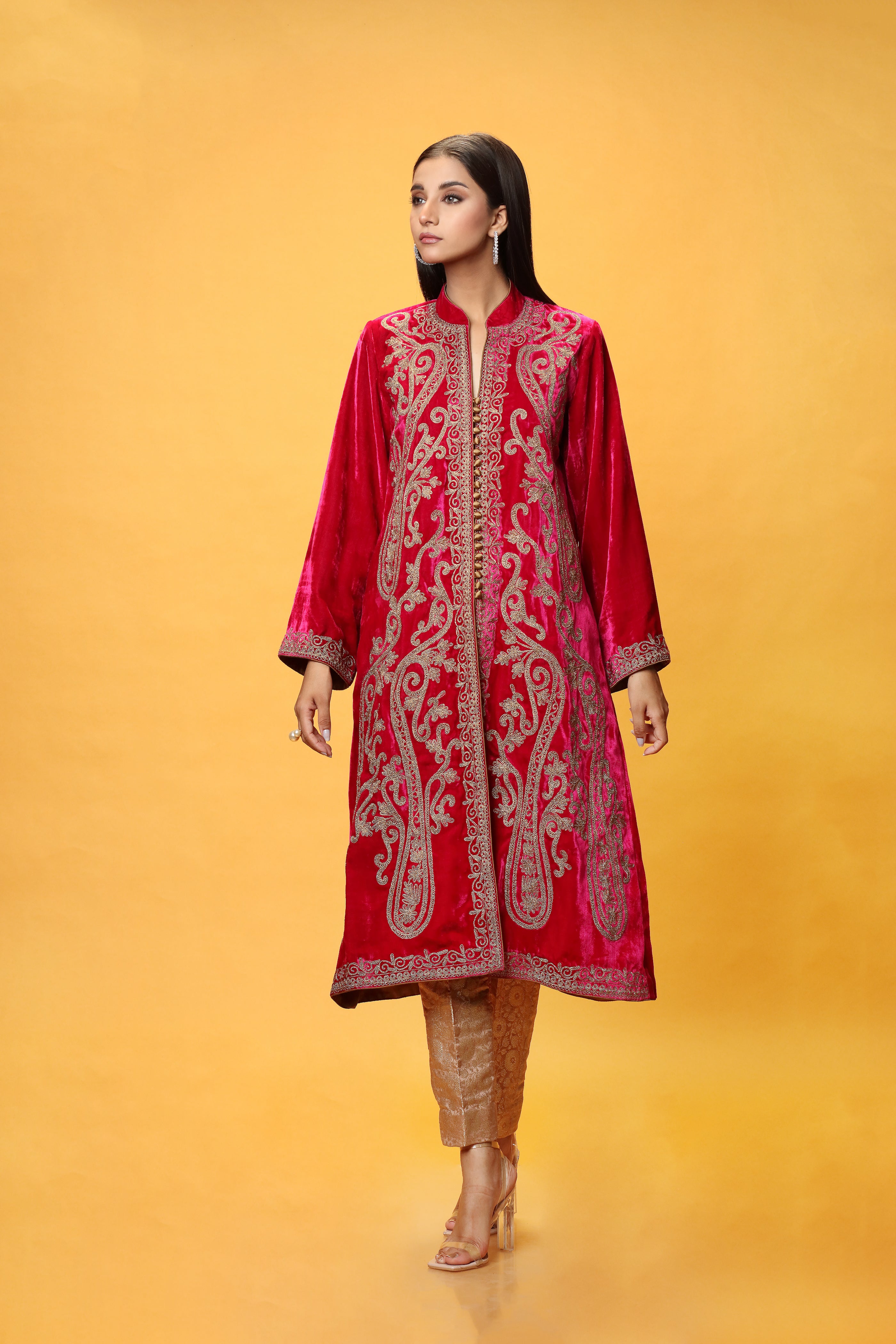 This Velvet coat features resham and tila embroidery in dull beige gold, finished with Silk buttons accents and edgings. Its a timeless